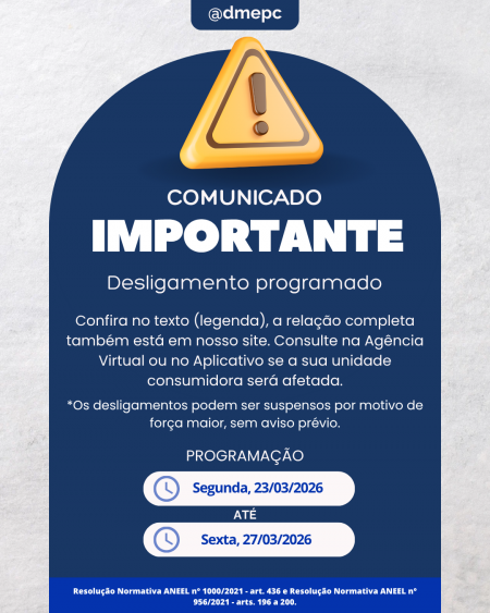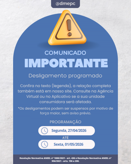 Acesse: Atendimento >> Agência Virtual >> Desligamentos Programados ou https://www2.dmepc.com.br/AgenciaVirtual/ServicosComplementares/DesligamentosProgramados