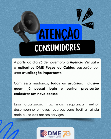 A DME informa que a partir do dia 26 de novembro, a Agência Virtual, acessada através do site da distribuidora, e o Aplicativo DME Poços de Caldas, passarão por uma atualização importante.